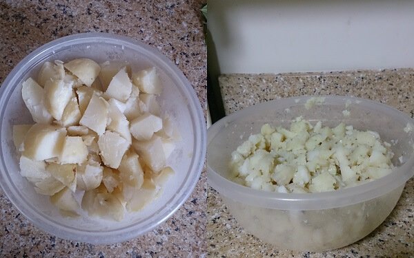 1. Wash and drain the soaked white peas, add salt, turmeric powder, 1 cup water and cook them in a presser cooker for 3-4 whistle. Allow to cool cooker, then remove boiled white peas from cooker and keep aside.2. Boil potatoes till cooked completely, then peel it and mash them coarsely, keep aside.